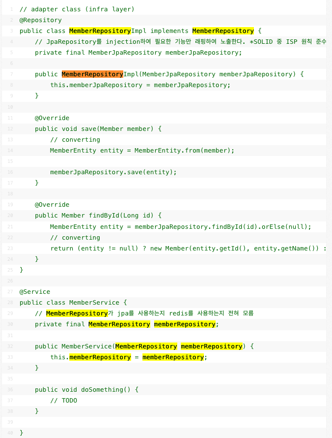 인프라의 interface MemberJpaRepository를 주입해버리는 것이다.