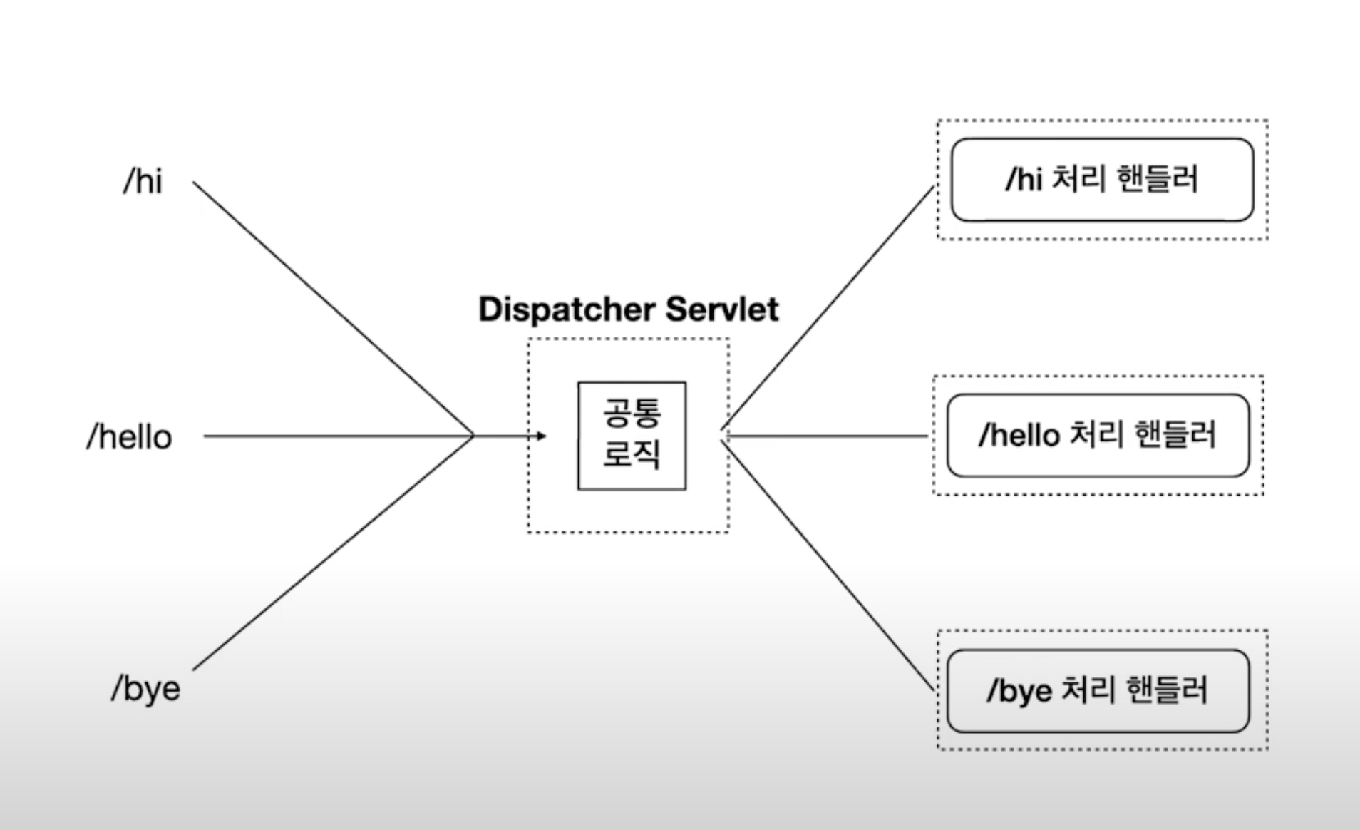 - 스프링 MVC는 클라이언트 요청을 디스패처 서블릿이 먼저 받아,